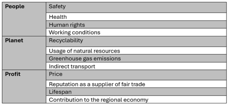 Based on these criteria, we have drawn up a number of considerations that we take into account when purchasing products and services, namely: